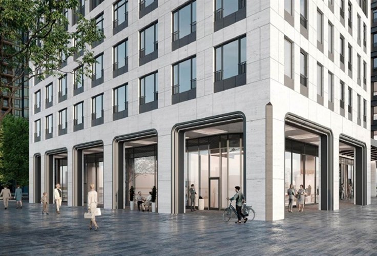 В качестве основного облицовочного материала используются крупноформатные керамогранитные панели с имитацией натурального белоснежного камня. Большие витрины коммерческих помещений первого этажа буквально добавляют воздуха и создают ощущение «парящего» фасада. Для дворового фасада и фасада отдельно стоящего въезда на подземный паркинг используется комбинация крупноформатных керамогранитных панелей разных оттенков коричневого.