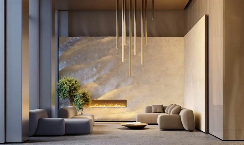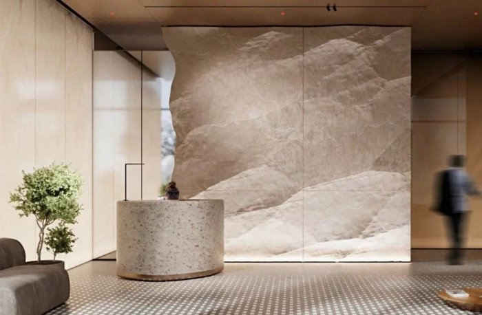 В оформлении лобби используются натуральные материалы - камень, металл.